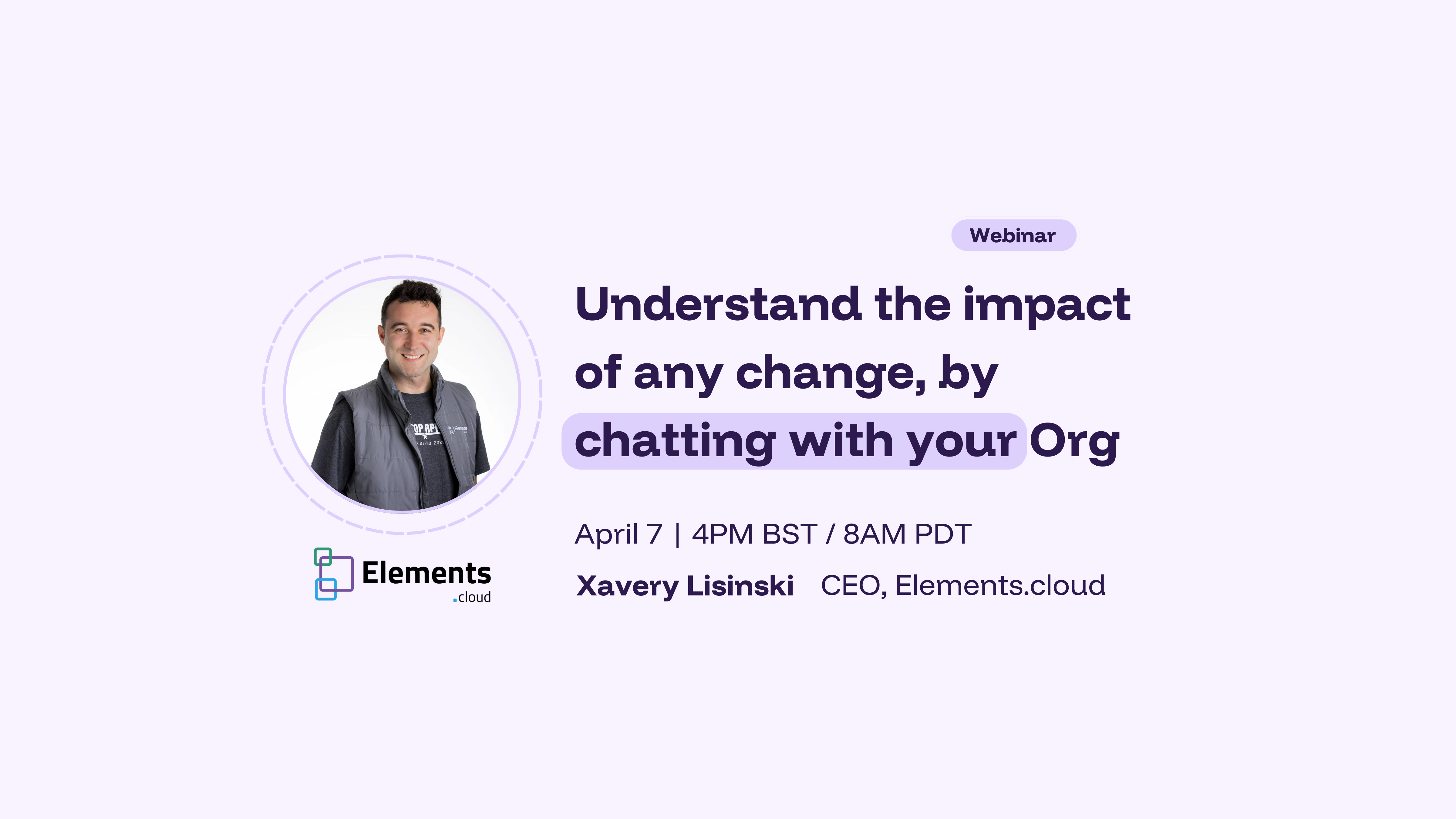 Webinar: understand change impact by chatting with your Org 7th April 2026 Virtual Stop guessing what a Salesforce change will break. Join us for the unveiling of the Elements.cloud Org Analysis Engine, a new capability that shows the downstream impact of Salesforce changes in seconds. No manual digging. No missed automations. No surprises. “If we change this… what else will break?” Manual impact analysis takes time. And even… Stop guessing what a Salesforce change will break. Join us for the unveiling of the Elements.cloud Org Analysis Engine, a new capability that shows the downstream impact of Salesforce changes in seconds. No manual digging. No missed automations. No surprises. Live launch: April 7th, 4PM BST / 8AM PDT What normally takes 30–60 minutes of investigation will be surfaced in seconds. Make changes with more confidence, quickly. Get the first look at our new Org Analysis Engine. Webinar sign-up “If we change this… what else will break?” Manual impact analysis takes time. And even then, it’s easy to miss something. Instead of manually investigating dependencies, the Org Analysis Engine will show you: The metadata affected by a proposed change Automation and processes that rely on it Permission implications A clear summary of downstream impact If you’ve ever hesitated before making a change because you weren’t sure what it might affect, this session is for you. Register to be part of the live product launch. Save your seat Post navigation Previous eventWebinar: Is your Salesforce Org ready for AI? Back to events Share