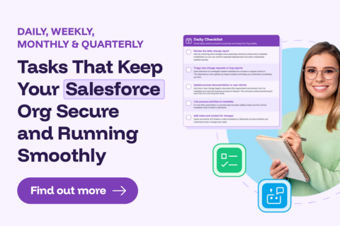 Document Daily, Weekly, Monthly & Quarterly Tasks That Keep Your Salesforce Org Secure and Running Smoothly Share Home » Whitepapers & eBooks » Daily, Weekly, Monthly & Quarterly Tasks That Keep Your Salesforce Org Secure and Running Smoothly Download PDF . Download Daily-Weekly-Monthly-Quarterly-Tasks-That-Keep-Your-Salesforce-Org-Secure-v2-Flattened Unleash Your Potential Build your Centre of Excellence with Elements.cloud Talk to us Post navigation PreviousInsiders Guide to Dreamforce 2025 Back to Whitepapers & eBooks Share